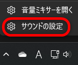 タスクトレイのサウンドアイコンから、「サウンドの設定」を開きます。