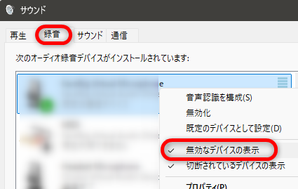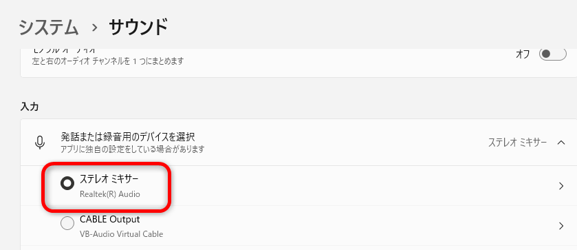 有効化すると、サウンドの設定の入力欄でステレオミキサーが選択できるようになります。