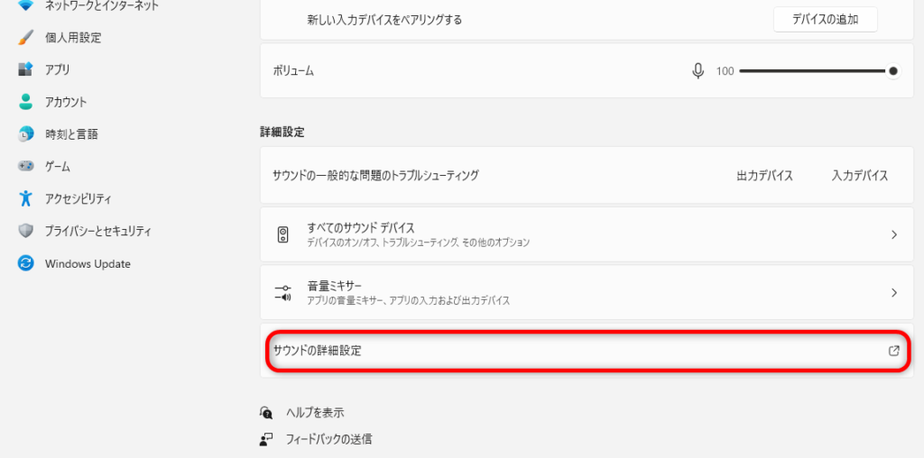 詳細設定から、「サウンドの詳細設定」を開きます。