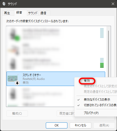 録音タブから、ステレオミキサーを右クリックして「有効」を選択